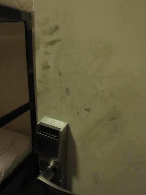 Plus it was equipped with video surveillance cameras. We later watched the footage, which showed two normal-looking guys in their mid-twenties walking up and down the hallway until one of them stands at our door with his hands near the knob. We think he was using some sort of device to fool the key card reader. He enters our room while the other guy watches the hallway. Then the first guy exits and the second guy goes in — maybe he had more expertise in opening lockers. They’re about to switch places again, but suddenly they both jump away from our door as an innocent guest comes into view walking to her room. When the coast is clear the first guy enters our room again and shortly thereafter leaves carrying his backpack. The entire process takes less than three minutes. They were clearly professionals, as evidenced by whatever technology they used to replicate the key cards and by their entry into the lockers — one of our locks was cut off and our other lock was in place but the locker’s hinges had been unscrewed.